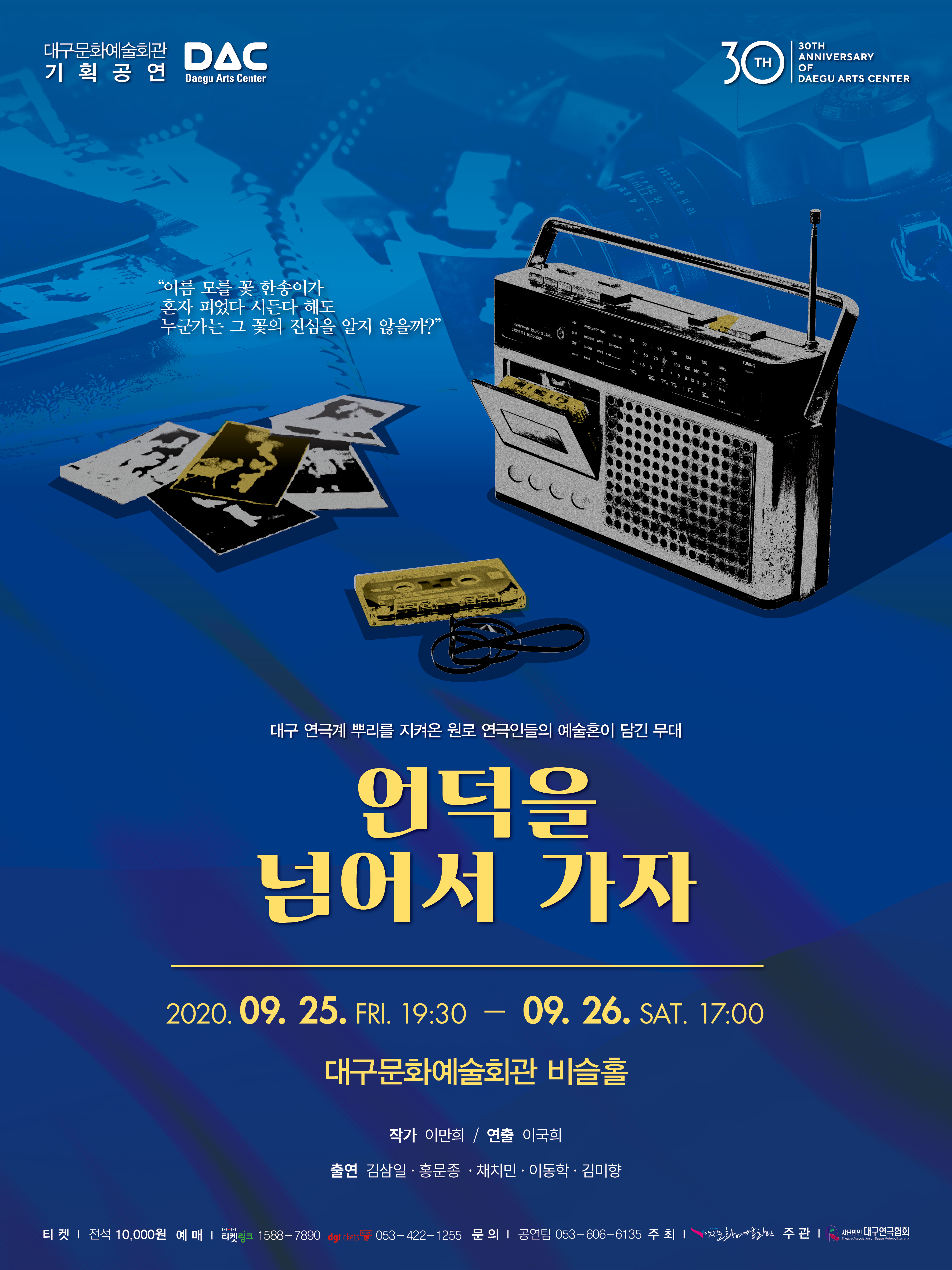 대구문화예회관은 9월 25일 오후 7시 30분, 26일 토요일 오후 5시 이틀간 지역 원로 연극인들의 무대로 이만희 작품의 “언덕을 넘어서 가자”를 선보인다.